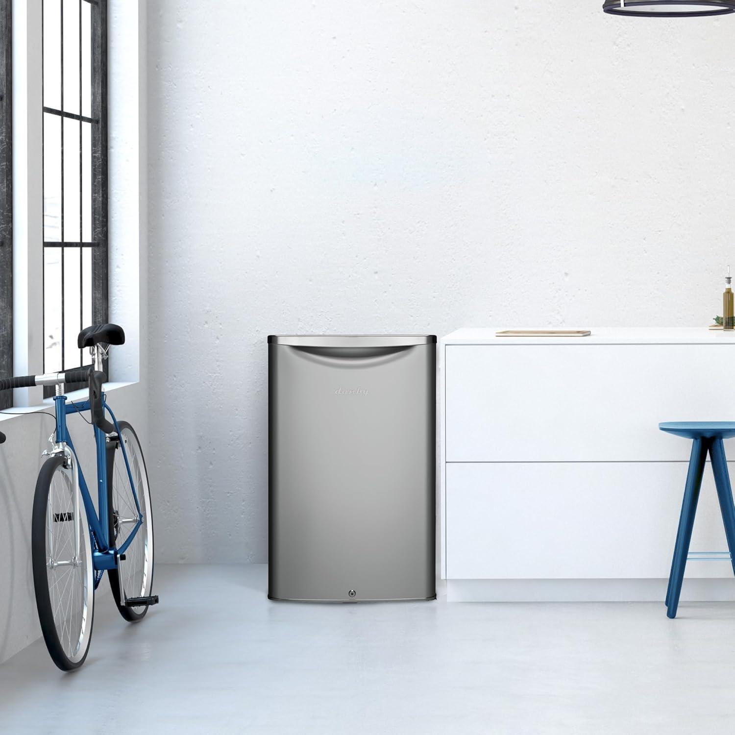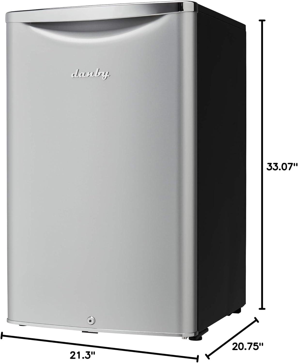 Drawing inspiration from mid-century styling and simplicity, Danby’s patented Contemporary Classic collection of compact refrigerators reimagine retro for the modern consumer. Featuring Danby’s exclusive retro-inspired curved door design, metallic door finish, door lock, rubber-grip ergonomic chrome handle and stylized chrome worktop, its exterior features are only outmatched by its signature black interior. Boasting 4.4 cubic-feet (124 liters) of storage and cooling space, it features two and a half tempered glass shelves for maximum storage versatility and a vegetable crisper with glass top. There’s more than enough room for larger bottles and the spacious unit helps keep electricity bills in check with its Energy Star rating and state-of-the-art mechanical thermostat. Maintenance and cleaning are as simple as can be with the automatic defrost system. It also includes an efficient CanStor beverage dispenser and reliable interior white LED light. This model is built for convenience as the reversible door hinge allows you to adjust it for either left or right-handed opening.