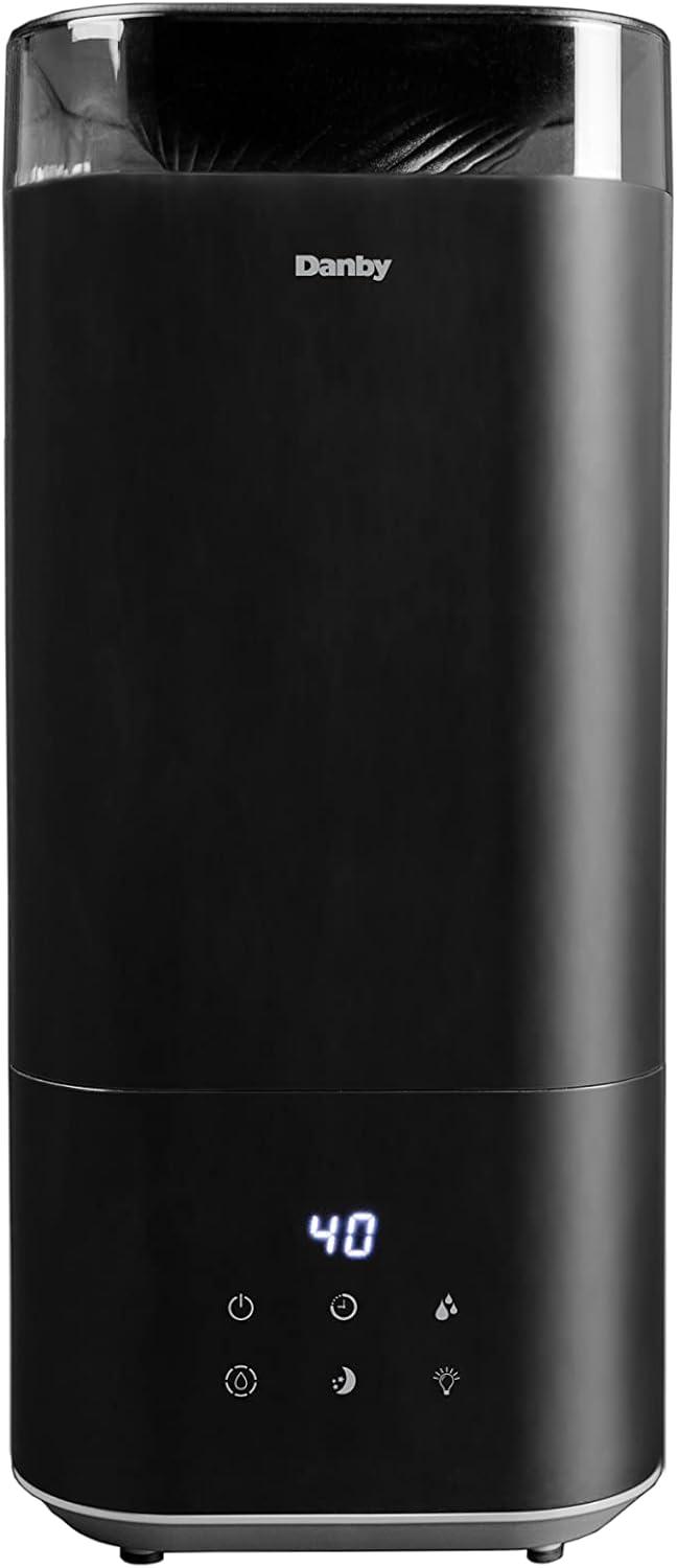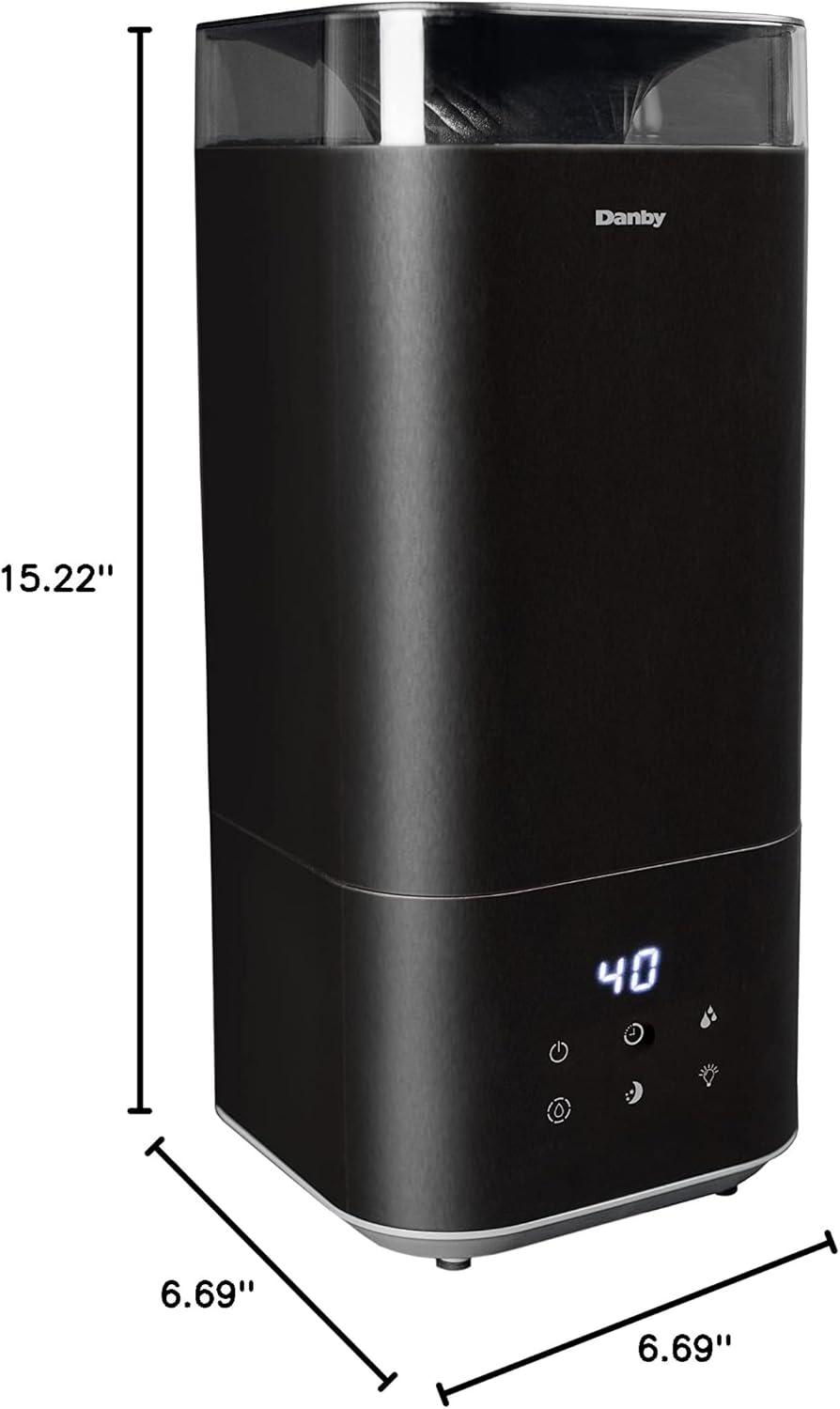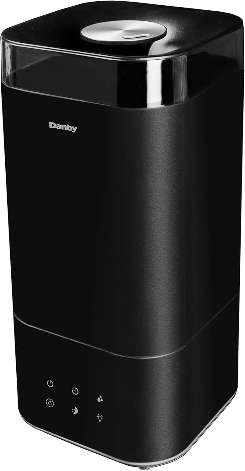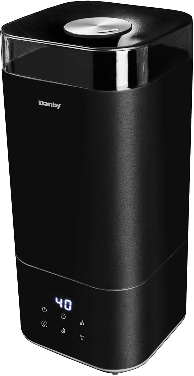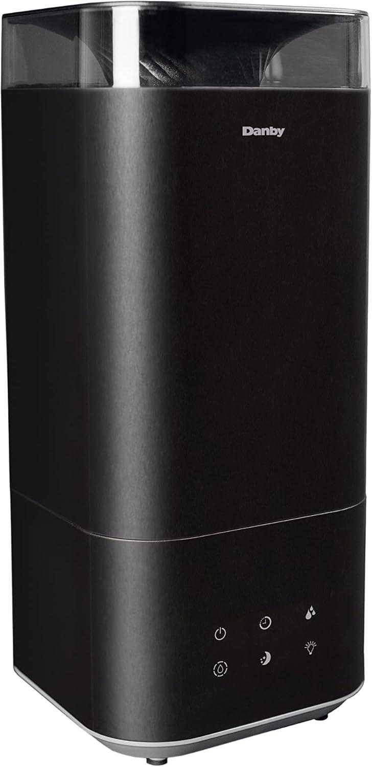 Dry weather can wear on your body and result in uncomfortable chapped lips, increased risk of colds, the flu, dehydration, and dry skin. Combat dryness with the Danby 5L ultrasonic top fill black humidifier, ideal for bedrooms, offices, or living rooms. Designed with ultrasonic technology, this model uses the energy of ultrasonic to mist water into tiny particles which blow into the air to increase the moisture content. Features include three digital settings for mist, 360-degree output, and a timer option with 1, 2, 4, or 8-hour settings, making this unit customizable to your preferences. Enjoy therapeutic benefits by utilizing the aroma diffuser feature to spread essential oils to create a personalized aroma experience. Maintenance is easy with its washable and reusable filter, and a complimentary second filter is included.