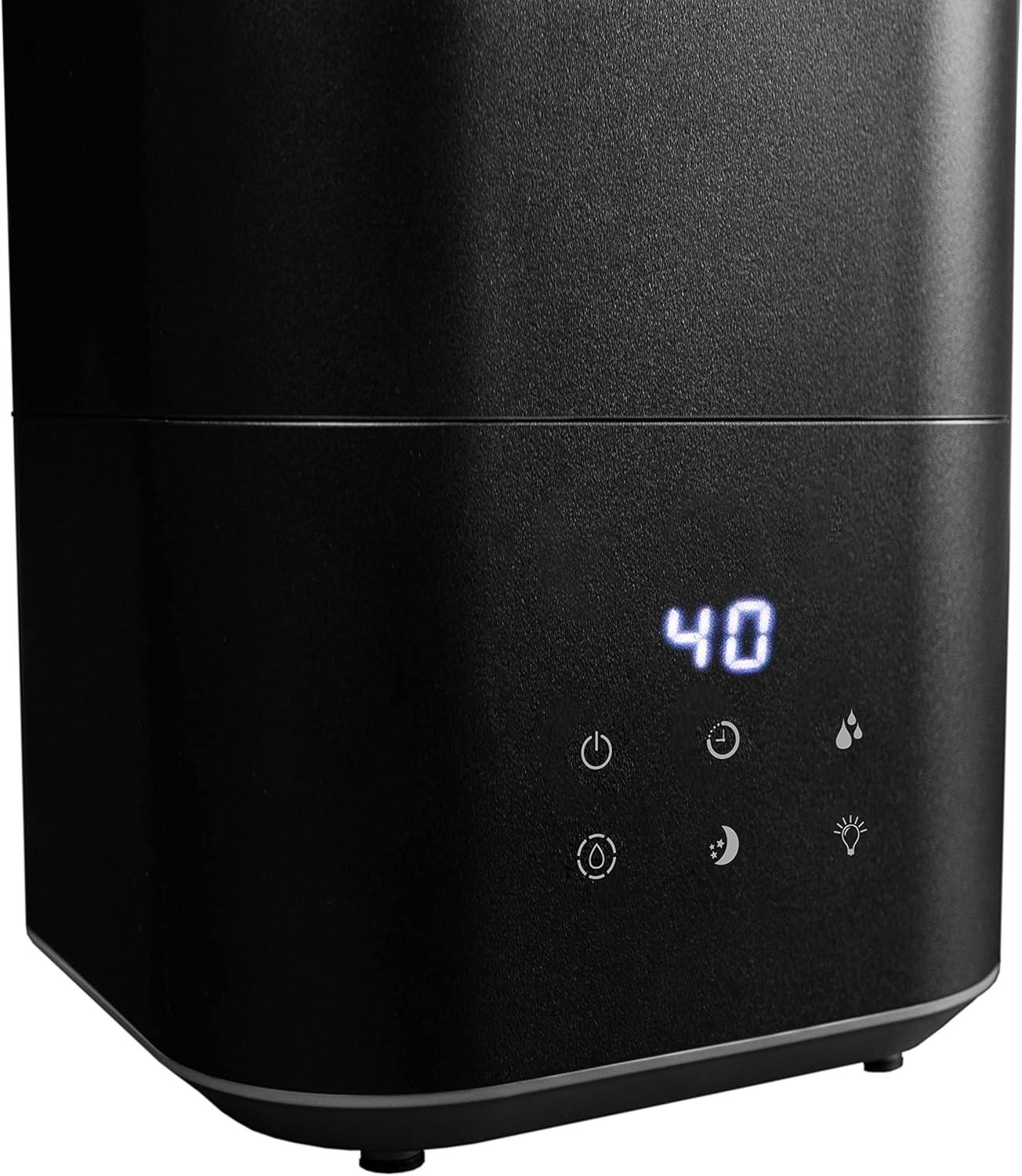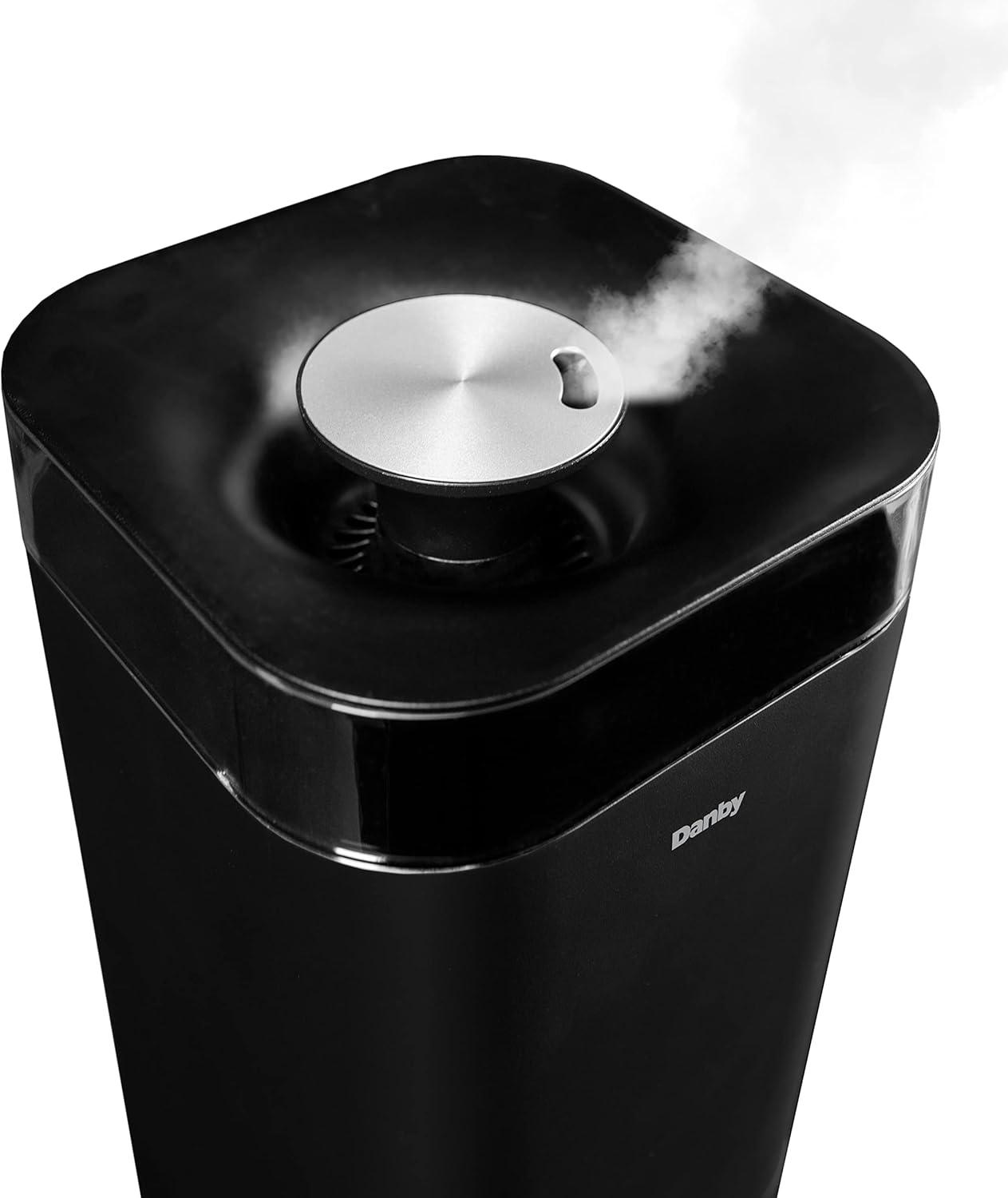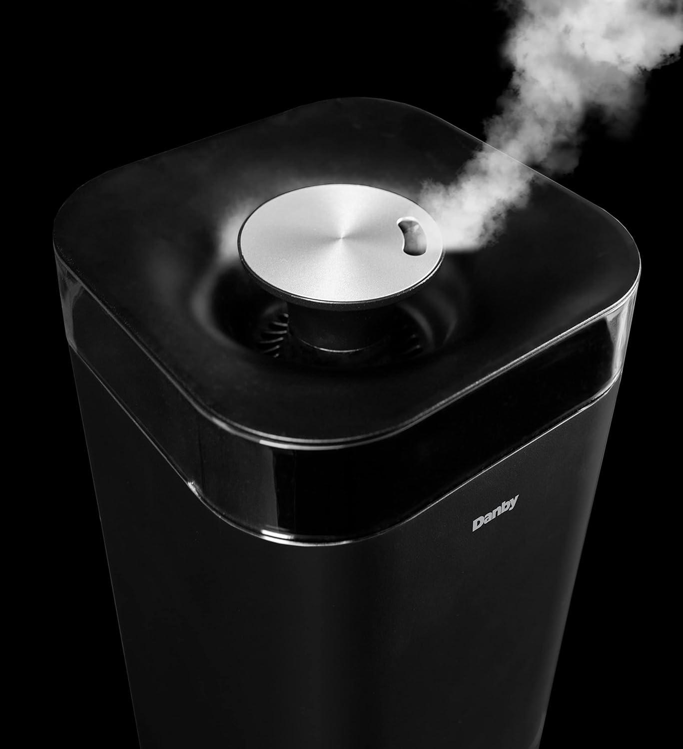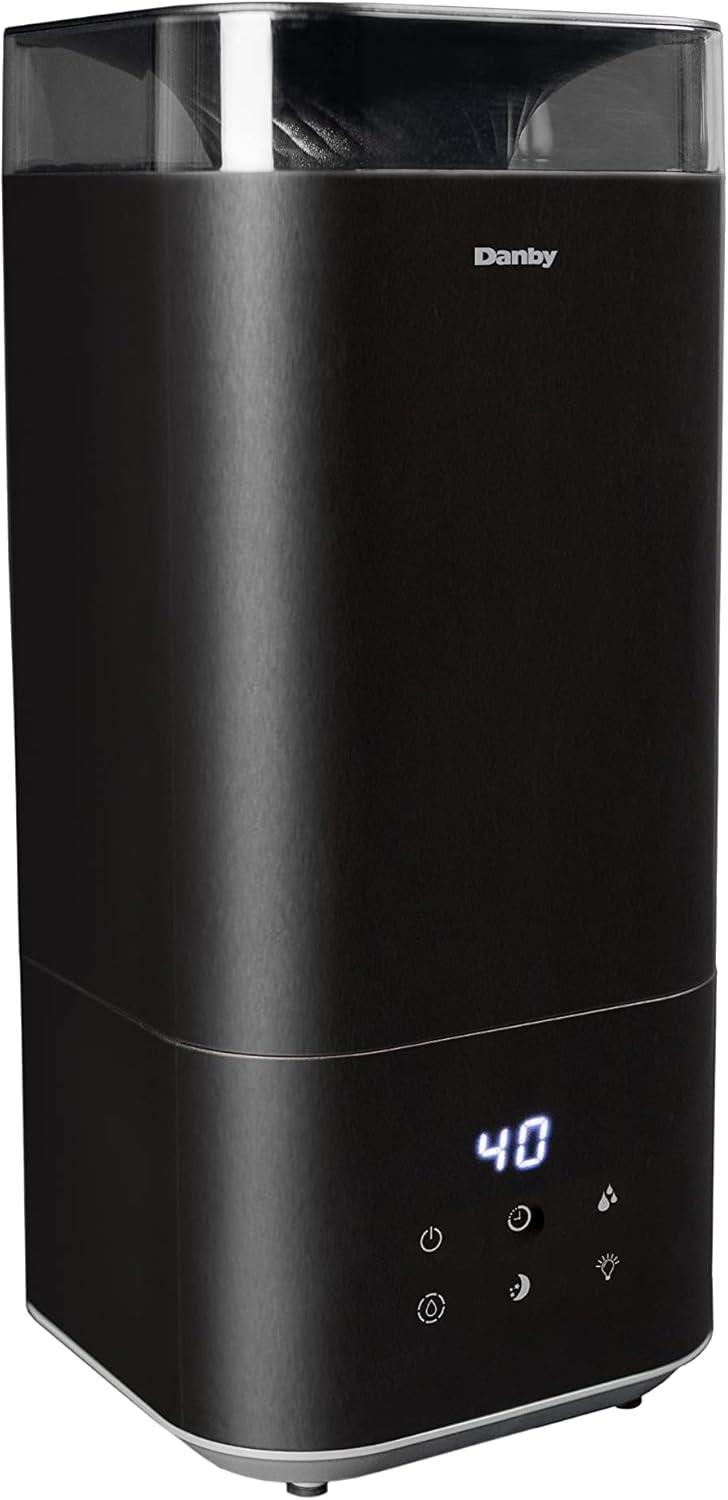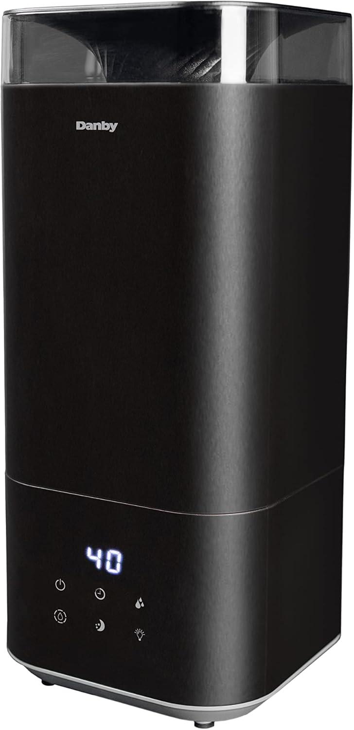 Dry weather can wear on your body and result in uncomfortable chapped lips, increased risk of colds, the flu, dehydration, and dry skin. Combat dryness with the Danby 5L ultrasonic top fill black humidifier, ideal for bedrooms, offices, or living rooms. Designed with ultrasonic technology, this model uses the energy of ultrasonic to mist water into tiny particles which blow into the air to increase the moisture content. Features include three digital settings for mist, 360-degree output, and a timer option with 1, 2, 4, or 8-hour settings, making this unit customizable to your preferences. Enjoy therapeutic benefits by utilizing the aroma diffuser feature to spread essential oils to create a personalized aroma experience. Maintenance is easy with its washable and reusable filter, and a complimentary second filter is included.