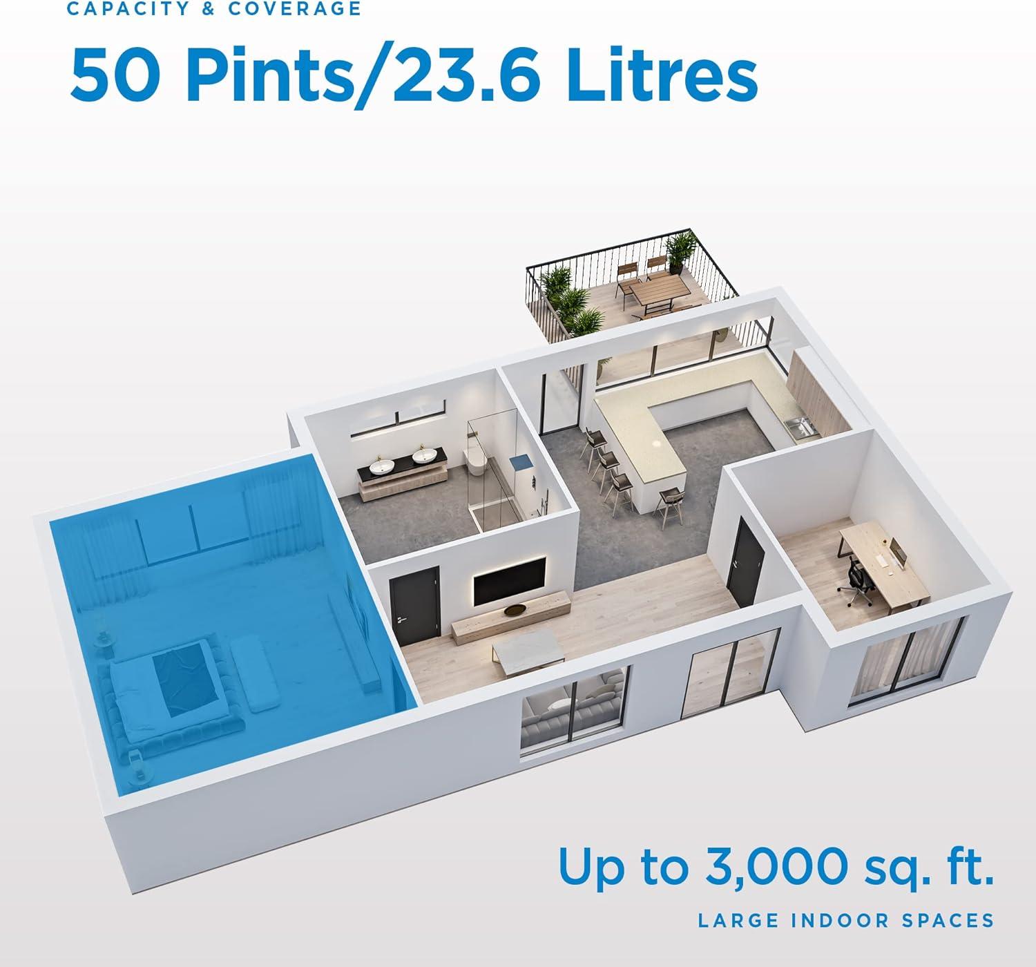 This Danby 50 pint dehumidifier with a pump helps protect your home from humidity by removing up to 23.6L of humidity per day. This is ideal for spaces up to 3,000 sq. ft., the Danby dehumidifier has an auto restart function that restarts your unit after a power failure, and an auto de-icer to prevent frost build-up. The 4 castors make moving from room-to-room very simple, and the Smart Dehumidify feature allows it to automatically control room humidity by factoring in ambient temperatures. The unit is Energy Star® Certified, so it runs economically, even in very humid environments. This model also features easy to use electronic controls with LED display, a reusable/washable filter, and a powerful 2 speed fan!