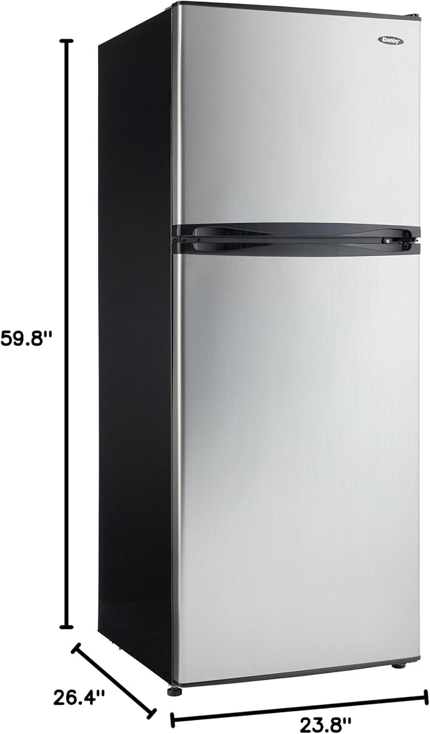 The Danby DFF100C1BSLDB 9.9 Cu. Ft. Mid-Size Frost-Free Refrigerator with Top-Mount Freezer has spotless steel doors that look identical to real stainless steel without the smudging! With adjustable shelving, a sizable crisper drawer and frost free operation, this model is sure to fit all of your refrigeration needs. At just under 60 inches tall and less than 24 inches wide, the compact design is ideal for condos, apartments or as a secondary refrigerator/freezer.